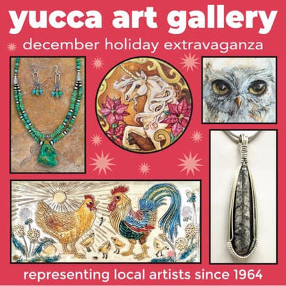 We’ve got double the joy for you this week! November 29 is Small Business Saturday, and every item you buy in our gallery is completely tax-free. Fast-forward to Dec. 5 and we have the First Friday of the holiday season. We’ll be jolly and merry until 8pm that day with festive treats and a whole sleigh-full of brand new treasures in our group holiday show. And don’t forget to enjoy all the blue lights and blue luminarias in our own Patio Market and check out the huge Christmas tree lighting on the Old Town Plaza!